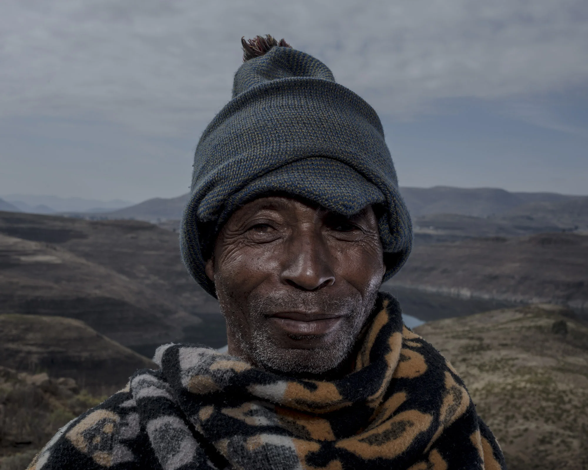 Initially I went to Lesotho to photograph the Basotho herders living alongside the Katse Dam in their traditional headgear, balaclavas. As someone who considers questions of privilege and power in relation to portraiture the conundrum of photographing subjects whose countenances are obscured by a woolen hat with only slits for eyes appealed to me. The portraits of the herders wearing their blankets are a by-product of my initial aim, but have come into their own – as equal, serene counterpoints to Balaclava series. These portraits humanise the balaclava photographs.
